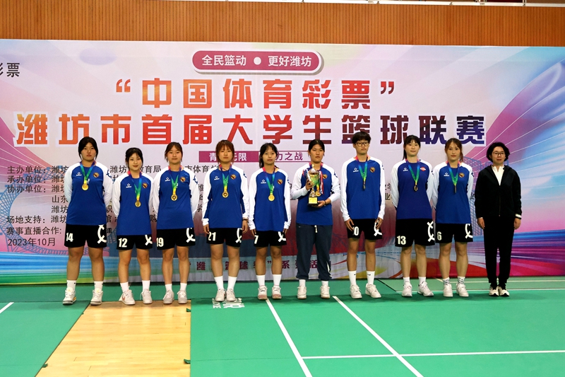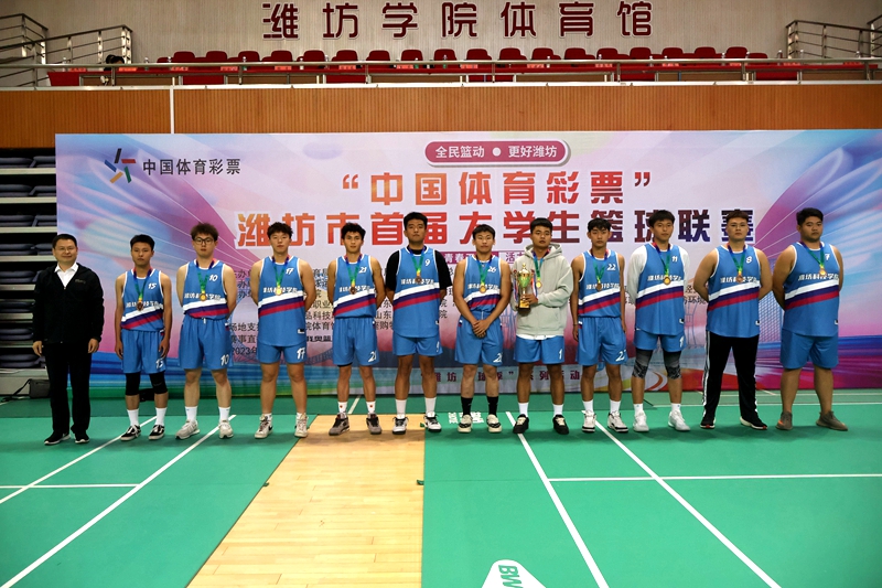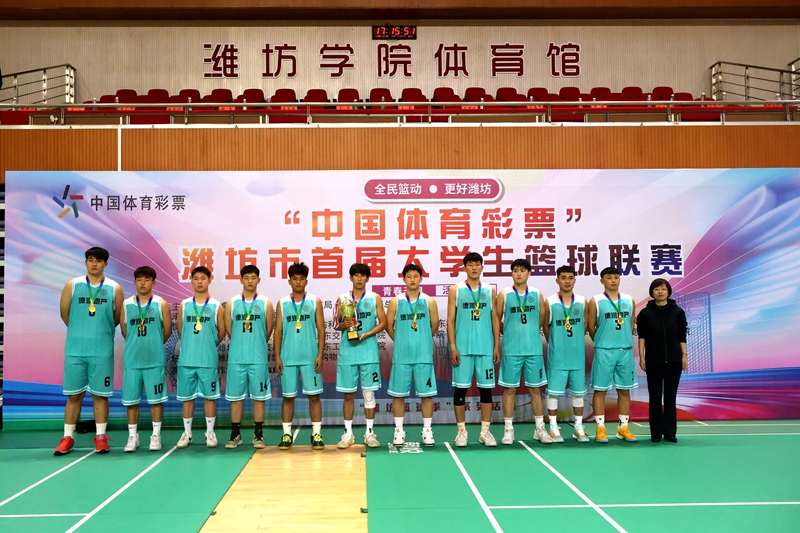 本网讯 10月29日下午,“中国体育彩票”潍坊市首届大学生篮球联赛闭幕及颁奖仪式在我校体育馆举行。潍坊市人民政府副秘书长王霞,潍坊市体育局党组成员、市体育总会主席王妍妮,潍坊市教育局总督学李萍,我校党委委员、副校长任立春等领导出席仪式,并为获奖代表队颁奖。参赛的19支球队和潍坊学院2000余名师生共同参加仪式。