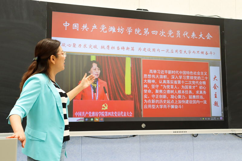 周莹从学校第四次党代会召开的主题和重要意义、宏大的“三步走”战略、清晰的“一二三四五”发展思路和办学治校的“八大工程”等方面,对党委书记徐梅同志在学校第四次党员代表大会上所做的党委工作报告《凝心聚力求突破 挺膺担当铸新篇 为建设国内一流应用型大学而不懈奋斗》进行了清晰解读与阐释。