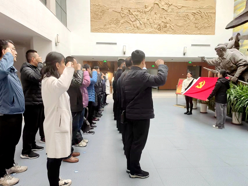 在宣誓厅,全体党员面向党旗,共同宣誓,重温入党誓词。