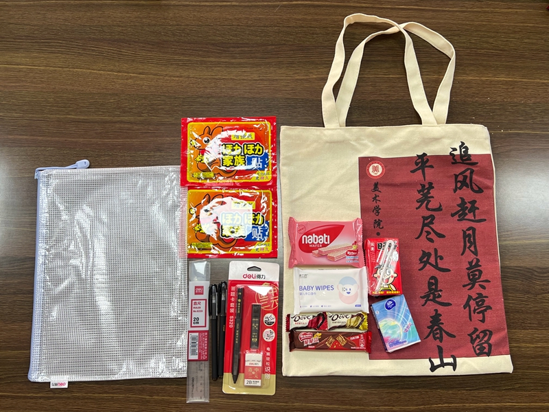 本次为2020级考研同学赠送的考研加油包是一个印制了美术学院院徽的红色手提袋,上书诗句:“追风赶月莫停留,平芜尽处是春山”,满载希望和祝福发放给同学们。袋中放有寓意考试“丝滑”的巧克力、祝愿“旺仔”的牛奶,还有文具袋、签字笔、暖宝宝、纸巾和湿巾等爱心满满的小礼物。这份考研加油包,寄托了学院对学子们的深深祝福与期望,鼓励他们在最后冲刺阶段保持良好心态,全力以赴迎接考试。