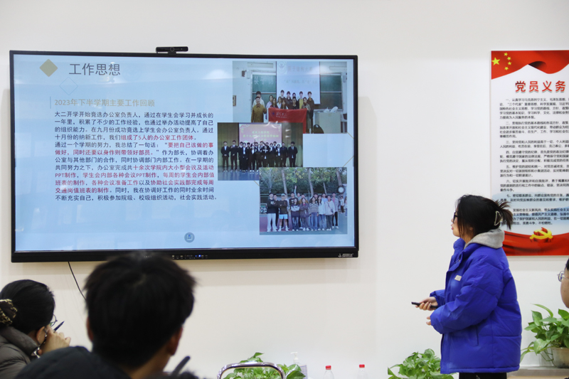 会上,各位学生干部代表依次紧紧围绕个人2023年度的学生干部工作、科创比赛、社会实践等方面进行汇报交流,通过讲述一件件生动的事例分享自己在学生干部工作中的收获,畅谈对未来发展的想法。