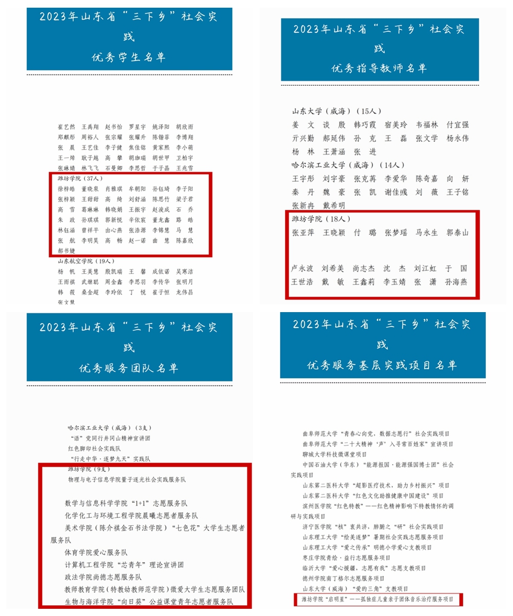 “调研山东”——暑期“三下乡”社会实践由团省委联合省委宣传部、省文明办、省教育厅等单位主办,以“学习二十大 永远跟党走 奋进新征程”为主题,组织动员全省大中专院校青年学生贴近人民群众、了解国情民意、施展才华抱负、服务奉献社会,以满怀的青春朝气和锐气,投身新时代社会主义现代化强省建设。经基层申报、审核推荐、组织评议等环节,全省确定80个优秀组织单位、1130名优秀指导教师、2180名优秀学生、520个优秀服务团队、100个优秀服务基层实践项目。