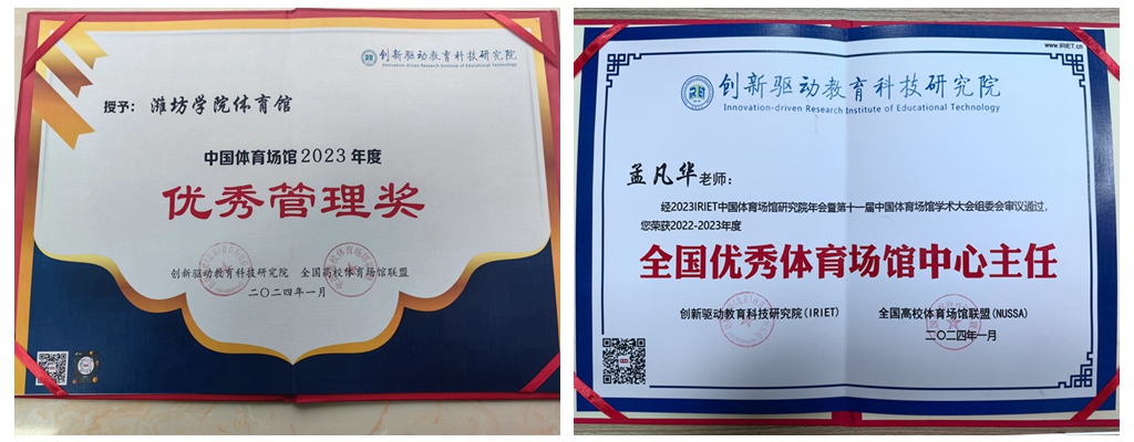 本网讯 1月12日至16日,2023年IRIET中国体育场馆研究院年会暨第十一届中国体育场馆学术大会在黑龙江省哈尔滨市召开。会上,我校当选为全国高校体育场馆联盟IRIET中国体育场馆研究院第四届副理事长单位,我校体育馆团队获得“中国体育场馆2023年度优秀管理奖”,体育馆管理中心主任孟凡华获得“全国优秀体育场馆中心主任”的荣誉称号。