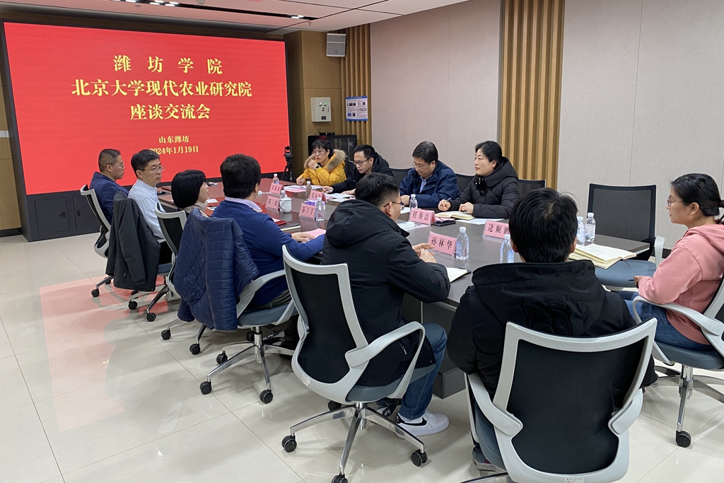 座谈会上,苏丁丁详细介绍了北京大学现代农业研究院的科研领域、师资队伍以及代表性研究成果,表示研究院在作物育种、基因组序列分析、计算生物学以及智慧农业等领域具有世界先进水平。侯金奎和任秀洁分别介绍了潍坊学院、我校计算机工程学院在师资队伍、教学科研、优势特色等方面的情况。随后,双方就教师访学、学生联合培养、科研合作等议题进行了深入探讨,并一致认为双方合作的潜力巨大,有助于实现双方的优势互补和发展共赢。