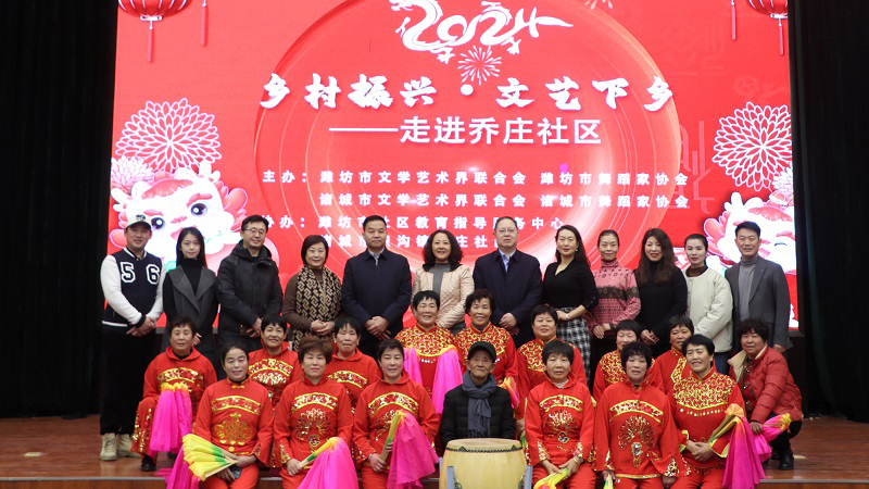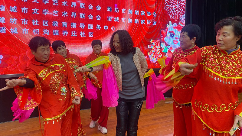 本网讯 1月19日,2024春节山东乡村文化旅游节“舞动千万家”——“扭起秧歌过大年”主题活动在潍坊诸城枳沟乔庄社区举行。该活动由潍坊市文学艺术界联合会、潍坊市舞蹈家协会主办,潍坊市社区教育指导服务中心等单位协办。潍坊市舞蹈家协会主席、潍坊市社区教育指导服务中心主任王昕对基层的广场舞队伍进行了专业的指导培训和现场教学。