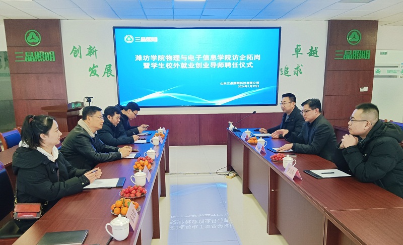 在校企合作座谈会上,三晶照明董事长兼总经理李福忠介绍企业产品研发、所获成果、技术与用人需求。于尔河介绍了学院专业设置、师资力量、毕业生数量与质量等情况。他表示,就业工作一直是学院最重要的工作之一,访企拓岗的目的就是要促进2024届毕业生尽快实现高质量就业,双方可以打造优势互补、资源共享的校企合作促就业新模式,实现互惠共赢,共同发展。校企双方还就人才招聘、学生实习实训、产教融合等方面的工作进行了深入交流。
