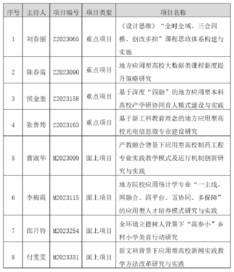 本网讯 近日,山东省教育厅公布了2023年本科教学改革研究项目立项名单,我校限额推荐的8个项目全部获批立项,其中重点项目4项,面上项目4项,立项层次和数量在全省同类高校位居前列。