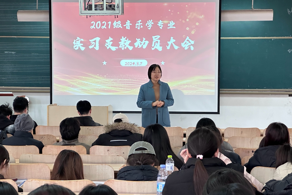本网讯 为进一步提高师范生的教育教学实践能力,扎实推进实习支教各项工作顺利开展,3月7日上午,音乐与舞蹈学院组织2021级音乐学专业学生召开实习支教动员大会。音乐与舞蹈学院党委书记刘希美、党委副书记刘江虹、2021级辅导员李广鑫参加大会。