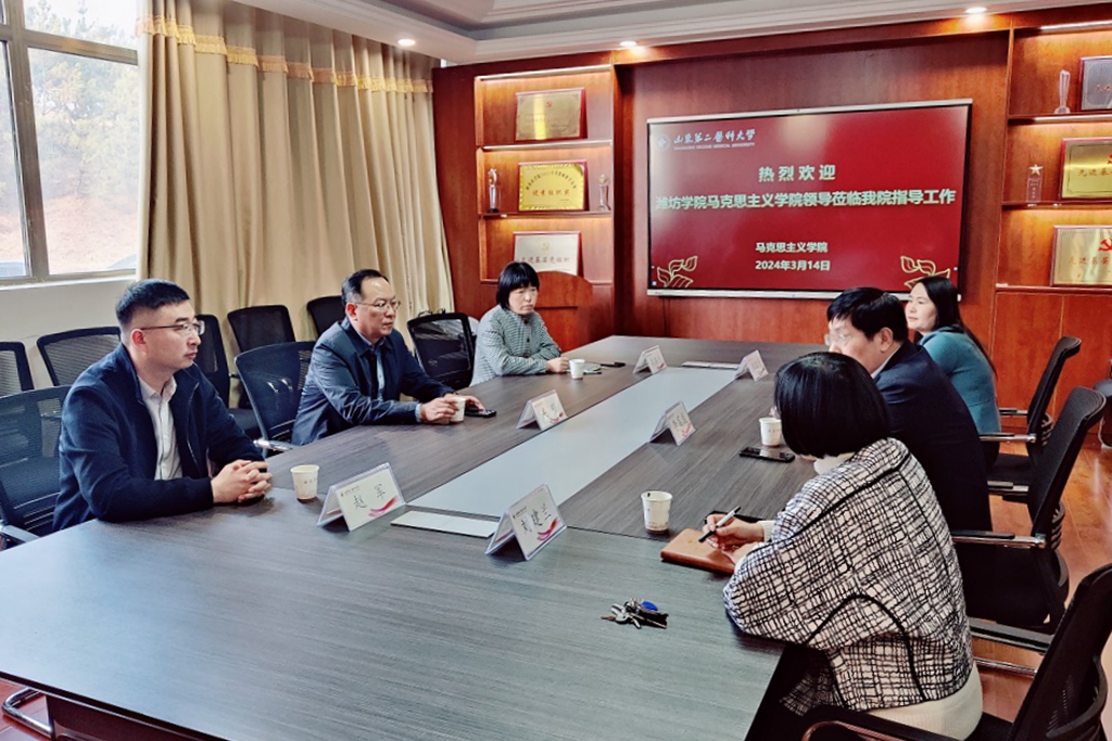 本网讯 3月14日,马克思主义学院党委书记吴明,副院长高海杰、赵军到山东第二医科大学学习交流,山东第二医科大学党委书记刘军出席活动。