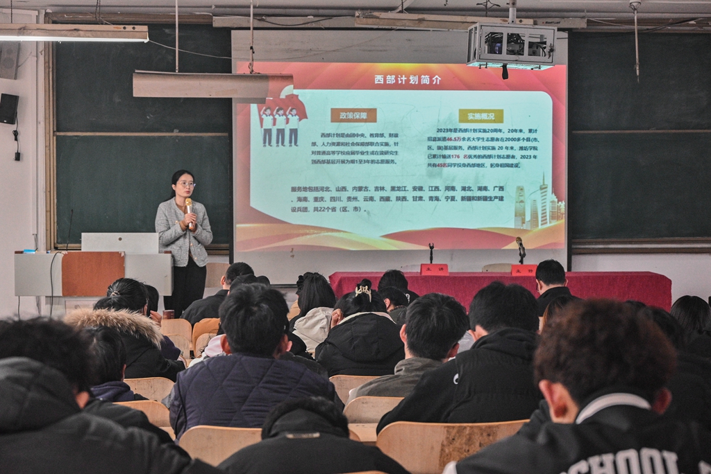 葛红丽介绍了学校就业相关政策,从毕业生就业时间轴、毕业去向、应届生界定以及学校就业服务措施等方面进行了生动具体地宣讲。她希望同学们树立正确的就业观念,克服“懒就业”“慢就业”思想,熟悉就业政策,明确就业方向,找到自己心仪的工作。孙婷婷详细解读了参军入伍优惠政策,强调了国家对军队建设的重视和对参军青年的关爱,希望同学们积极响应国家号召,投身军营,用青春书写军旅人生。张亚萍宣讲了西部计划的相关政策,分享了我校优秀毕业生西部支教的经历和感受,激励毕业生积极申请参与西部计划,为国家的教育事业和西部地区的发展贡献自己的力量。李玉强具体介绍了毕业生信息录入系统的操作流程,希望同学们规范操作,共同维护好就业信息。魏星立足学生实际情况,从线上签约到线下合同,对体育学院2024年就业工作进行了安排部署。