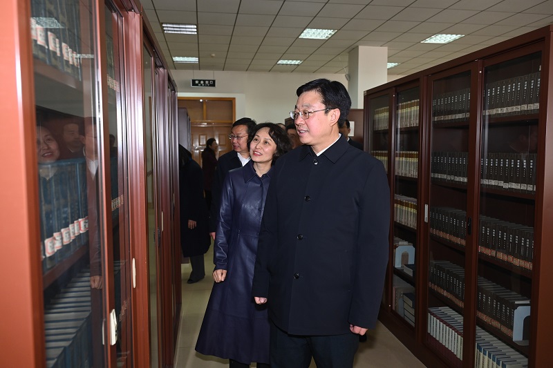 会前,刘运先后来到潍坊学院岳镇海渎研究院、古籍馆,仔细阅览文献资料、馆藏作品,详细了解文化遗产研究、古籍保护、人才培养等情况。在岳镇海渎研究院,刘运阅览了研究院收藏的镇山碑刻拓本文献,了解了研究院的团队建设、科研方向及相关科研成果,希望研究院充分发挥人才、科研优势,保护传承好岳镇海渎这一具有独特价值的人类珍贵遗产。在古籍馆,刘运听取了馆藏现状以及图书馆正在开展的古籍修复保护、古籍进课堂情况汇报,查看了馆藏清代刻本《佩文韵府》《渔洋山人精华录训纂》等珍贵古籍,询问了图书馆古籍与地方文献资料的整理及保护工作,并鼓励古籍馆发挥特色优势,助力文化潍坊建设。