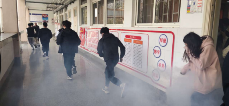 演练开始后,火警信号响起、实验室烟雾散出,在老师的引导下,20余名学生降低重心、俯身向下紧张有序地通过安全出口。整个过程中,学生们始终保持冷静并按照疏散预案有条不紊地撤离现场。随后,安全保卫处老师介绍了消防器材的使用方法,部分学生、教师体验了灭火器现场灭火。