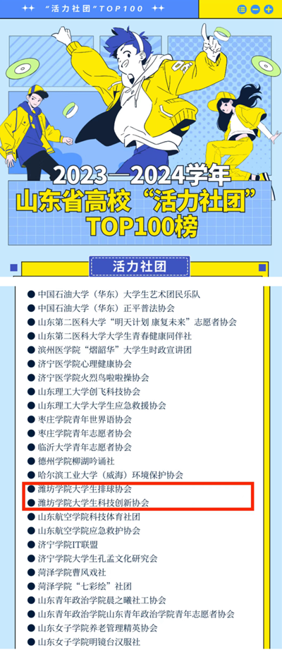 本网讯 近日,在团山东省委学校部、山东省学生联合会开展的2023—2024学年高校“活力社团”风采展示活动中,学校大学生排球协会、大学生科技创新协会入选2023—2024学年山东省高校“活力社团”TOP100榜单。