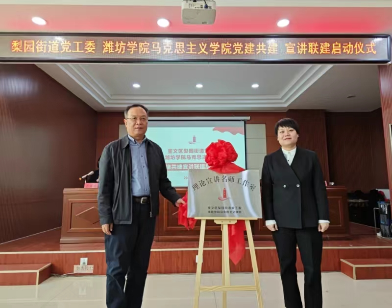 启动仪式上,吴明与梨园街道党工委书记徐正立签订《党建共建宣讲联建合作协议》,吴明与奎文区委常委、宣传部部长、区教育工委书记王晓丽为理论宣讲名师工作室揭牌。