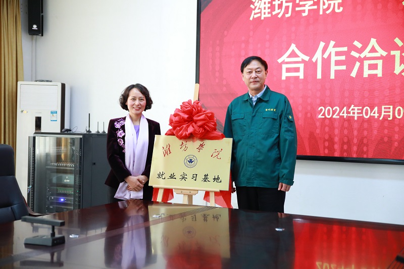 徐梅介绍学校基本情况,特别是在推进校地融合发展、服务区域经济社会和促进学生就业等方面的举措和成果。汲英民高度肯定了学校服务地方的能力和水平,期待与学校开展更多务实合作。双方围绕毕业生招聘、科技成果转化等进行深入交流。会上,徐梅和汲英民共同为“潍坊学院就业实习基地”揭牌。