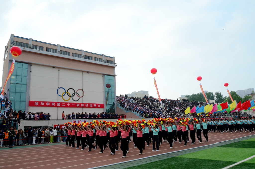 8点整,伴随着运动员进行曲,国旗校旗护卫队、花束方队、彩旗方队、裁判员方队作为先导方阵首先进入会场。19支二级学院代表队用精心设计的标牌、奋发向上的口号,结合专业进行了各具特色的方阵表演,彰显了潍院学子的青春活力和昂扬向上的精神风貌。