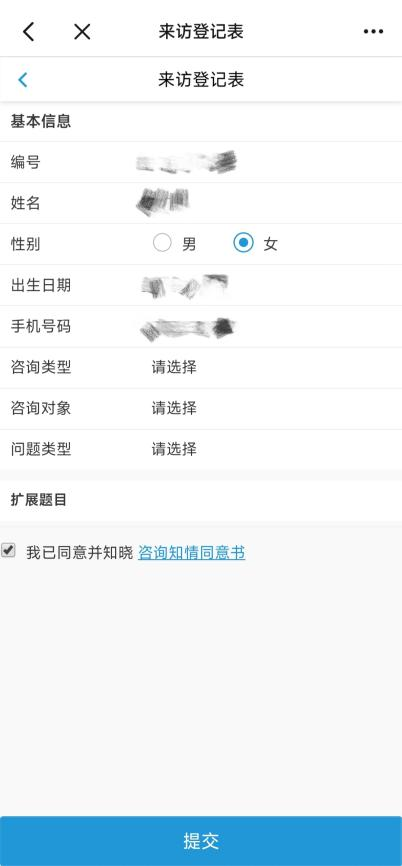 5. 填写来访登记信息让咨询师对你所要咨询的问题有初步的了解。需要阅读《咨询知情同意书》并勾选已同意,方可提交登记表