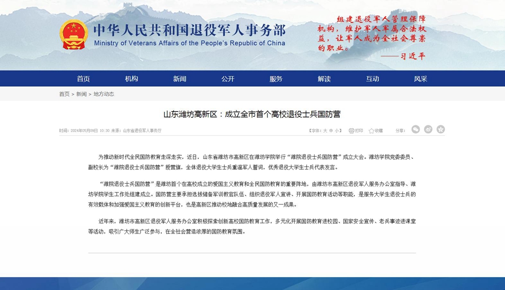 本网讯 近日,我校“潍院退役士兵国防营”正式成立。作为潍坊首个在高校成立的退役大学生组织,该做法被中华人民共和国退役军人事务部官方网站报道。