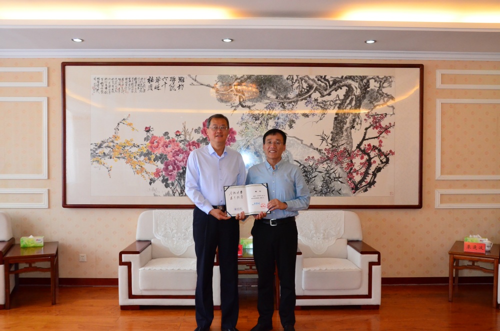 来逢波为朱晓峰颁发特聘教授聘书。
