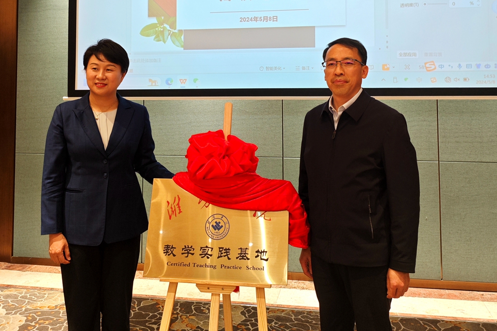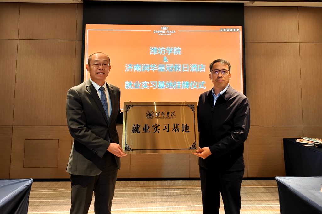 在济南润华皇冠假日酒店,武玉杰一行实地参观考察了酒店各功能区设施条件和实习生住宿环境,听取了酒店行政助理经理李勇对酒店管理理念、实习生培养方案和招聘岗位需求等方面的介绍,并与李勇为潍坊学院“就业实习基地”揭牌。在山东舜和酒店集团,武玉杰一行实地参观考察了集团的餐饮、客房、后台的相关环境和制度文化建设,听取了集团副总裁白璐对集团文化建设、校企合作、实习生培养方案和产教融合等方面的介绍,并与白璐为潍坊学院“教学实践基地”揭牌。