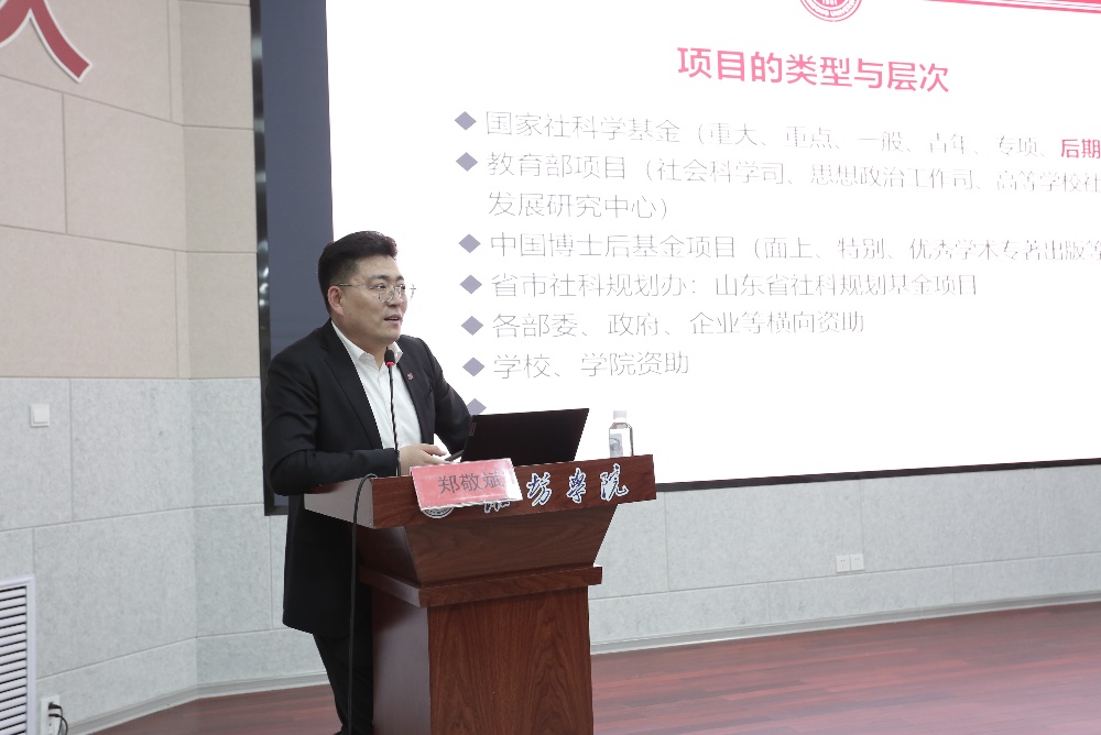 本网讯 为全面提升学校师生在人文社科领域的科研能力,5月11日,学校邀请山东大学人文社科研究院院长、山东省高校思想教育教学研究会会长郑敬斌教授作专题学术报告。报告会由学校党委副书记、校长来逢波主持。