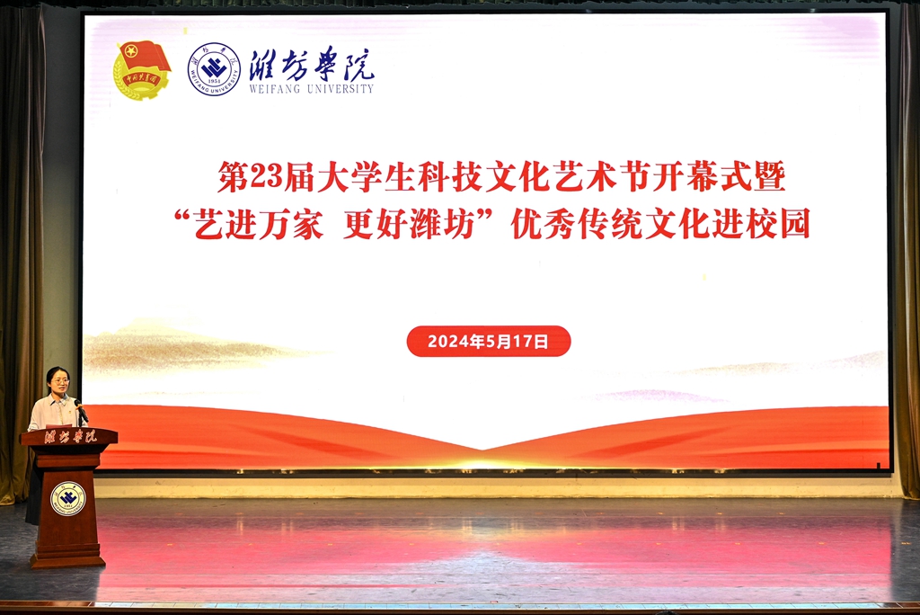 本网讯 5月17日,我校“挺膺担当励青春 奋楫笃行向未来”第23届大学生科技文化艺术节开幕式暨“艺进万家 更好潍坊”优秀传统文化进校园活动在图书馆报告厅举办,潍坊市曲艺家协会秘书长任健、副秘书长吴天忍受邀出席活动。