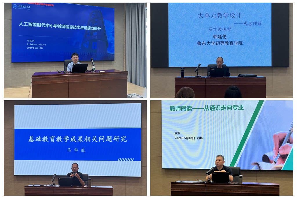 培训会上,北京师范大学李东兴教授作了题为《人工智能时代中小学教师信息技术应用能力提升》的专题报告,他从人工智能的发展历程、人工智能对教育的影响等方面作了精彩发言。谈到人工智能背景下中小学教师面临的挑战与机遇,他与学员们一起探讨了中小学教师信息技术应用能力提升的路径与方法。鲁东大学韩延伦作了题为《大单元教学设计——观念理解及实践探索》的专题报告,他从老师们观念认识上的困惑入手,围绕如何认识”大单元教学”、如何设计“大单元教学、如何验证“大单元教学”的高质量高效益三个核心问题与学员们进行了交流研讨。齐鲁名师、省特级教师、青岛中学正高级教师李波,从教师阅读的价值思考——为什么阅读、教师阅读的书目选择——阅读什么、教师阅读的策略方法——阅读案例等三个方面为学员们作了题为《教师阅读——从通识走向专业》的专题报告。教育部师范专业认证专家,国培项目专家马华威教授,则聚焦循证校本教研,与学员们共同探讨了循证校本教研的时代要求、核心理念、操作模式。马华威教授的《基础教育教学成果相关问题研究》专题报告围绕教学成果培育和教学成果文本撰写两个核心问题展开,为学员们申报教学成果提供了有益借鉴。