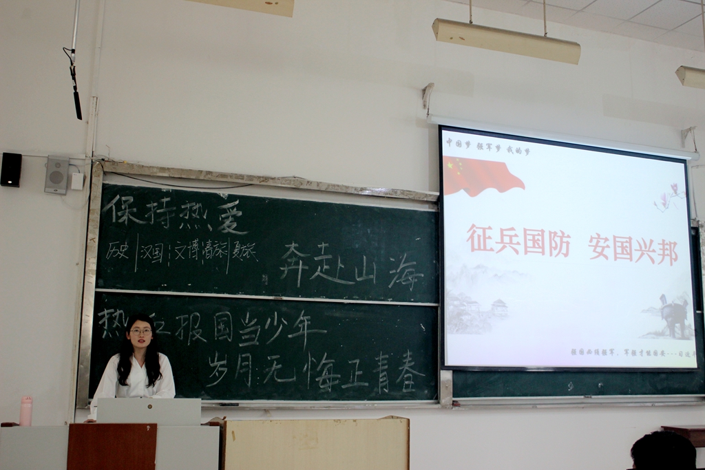 本网讯 为鼓励和引导青年学生积极响应祖国号召,投身军营、献身国防,激发大学生从军报国的理想追求,5月23日,文史学院(文化与旅游学院)举办大学生应征入伍政策宣讲会。学校国防教育中心副主任孙婷婷、文史学院毕业班辅导员、全体毕业生参加宣讲会。