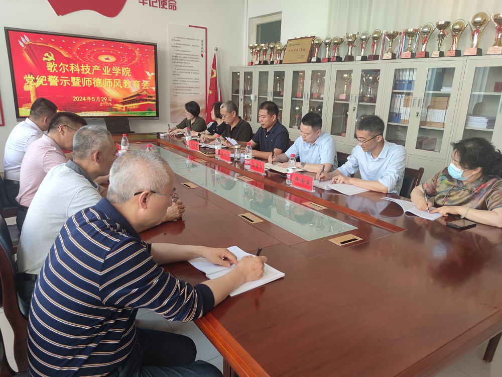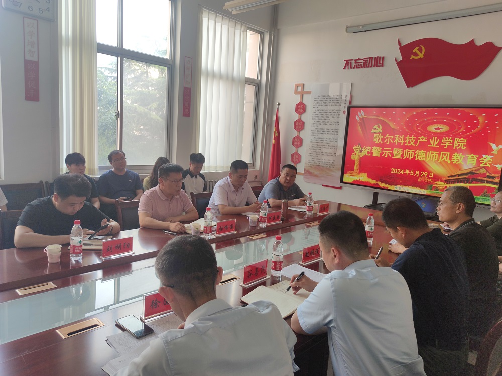 本网讯 为加强学院师德师风建设,筑牢广大党员干部的纪律防线,持续推动学院党纪学习教育向纵深发展,5月29日下午,歌尔科技产业学院召开党纪警示教育暨师德师风教育会议。学校党纪学习教育督查组成员、纪委副书记孙绪才及有关同志与会指导。学院党委书记赵鹏俊主持会议。学院全体教师党员参加会议。