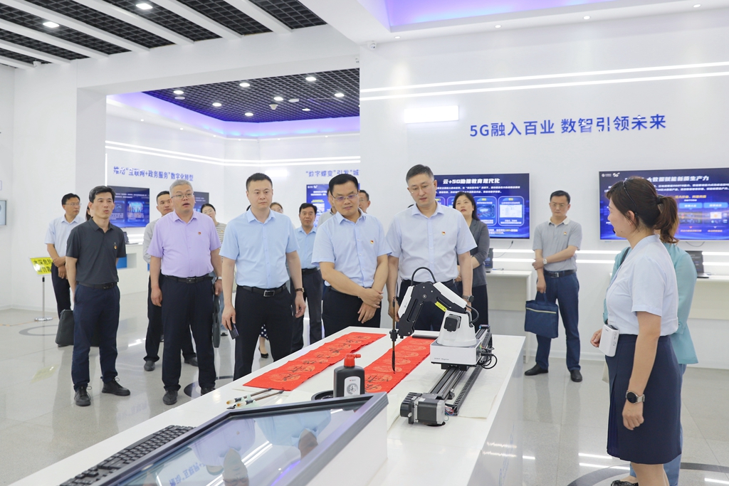 赵加强一行参观了潍坊新质生产力展厅和智慧党建展厅,详细了解了5G技术在各个领域的应用、中国通信行业的发展史以及潍坊移动公司党建工作的特色和亮点。