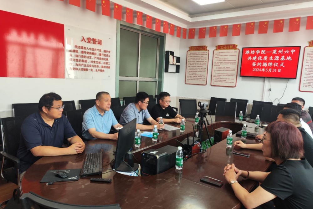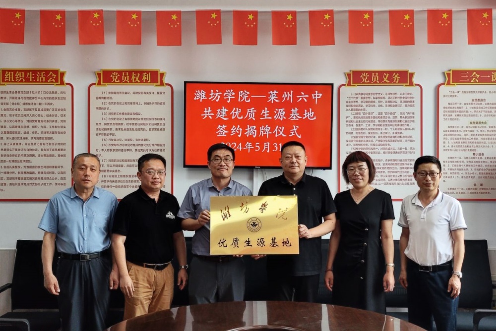 本网讯 近日,学校经济管理学院院长刘伟一行4人走访莱州市第六中学,并签约优质生源基地。莱州市第六中学党总支书记胡智鹏参加活动。