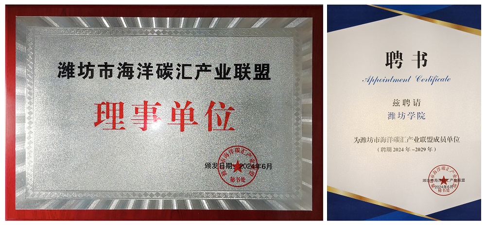 本网讯 6月5日,由潍坊市海洋发展和渔业局主办,潍坊市海洋发展研究院承办的潍坊市海洋碳汇产业联盟成立大会在富华国际会议中心召开,大会以“聚智汇能 迎‘蓝’而上 ‘碳’路未来” 为主题,揭牌成立了全省首家地市级海洋碳汇产业联盟,我校成为潍坊市碳汇产业联盟理事单位。