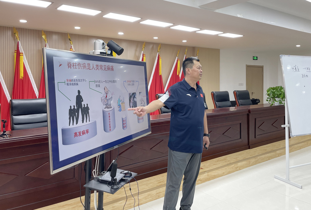 6月21日下午,体育学院副院长王华刚走进奎文区东关街办苇湾社区为辖区居民开展“脊柱康复运动处方”健康知识讲座,40余名社区居民参加。王华刚通过具体案例为居民们讲解脊柱的重要性,以及常见疾病的症状、预防措施以及现代康复技术,重点讲解了保持正确的坐、站、睡姿对维护脊柱健康的关键作用,并现场传授操作简单而有效的脊柱保健操。社区居民们积极提问,互动交流,现场气氛十分热烈。