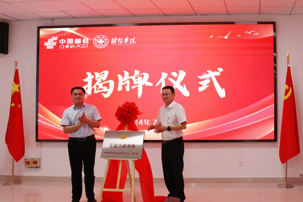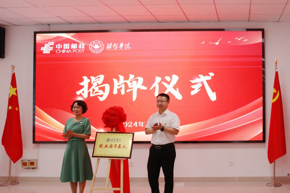 本网讯 7月2日,潍坊学院—中国邮政潍坊分公司就业实习基地、党建共建基地揭牌仪式在潍坊市邮政公司举行。学校党委书记徐梅,党委委员、组织部部长赵加强,中国邮政潍坊分公司党委书记、总经理史付贵,党委委员、纪委书记潘育,党委委员、副总经理张海英,党委委员、副总经理周晓华出席仪式。