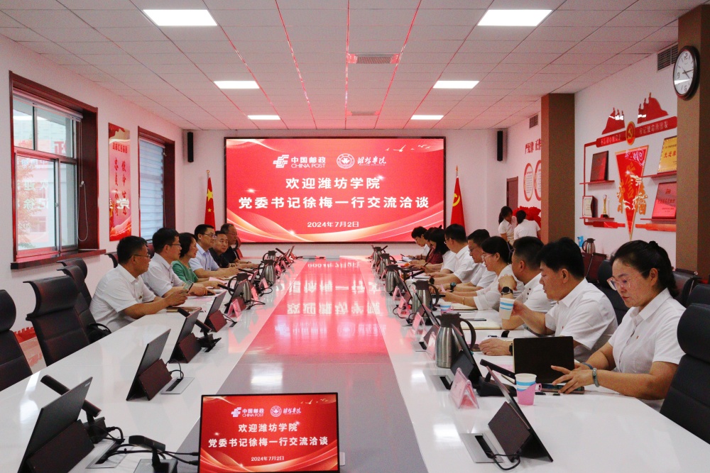 徐梅介绍了学校的基本情况,特别是在“产教融合、科教融汇、职普融通、校城融生”等方面取得的成果和学校未来发展目标。她指出,潍坊学院与中国邮政潍坊分公司长期保持着良好合作关系,本次共建就业实习基地、党建基地将是校企深化合作的又一崭新起点,学校将进一步发挥自身人才、科技优势,在服务中国邮政潍坊分公司引领行业新发展、激发新动能、实现新跨越等方面迈出新的步伐。同时,也欢迎中国邮政潍坊分公司利用自身资源优势,深度参与学校人才培养、科学研究、学术交流等方面工作,一起打造校企合作、融合共赢的典范,共同为建设“更好潍坊”作出新的更大贡献。