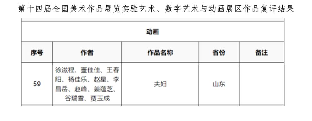 本网讯 近日,第十四届全国美术作品展览实验艺术、数字艺术与动画展区作品复评结果揭晓,学校传媒学院教师董佳佳带队创作的动画片《夫妇》入选。