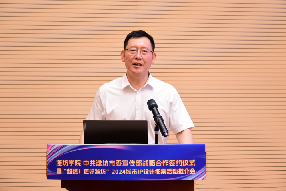 本网讯 7月9日,潍坊学院与中共潍坊市委宣传部战略合作签约仪式暨“超燃!更好潍坊”2024城市IP设计征集活动推介会,在学校知新楼报告厅举行。市委常委、宣传部部长杨建华,市委宣传部分管日常工作的副部长、市文明办主任、市新闻办主任孙磊,市委宣传部副部长田义明,潍坊日报社党委副书记、总编辑、总经理蔡相山,市教育局党组副书记、市委教育工委副书记王妍妮,市文化和旅游局党组成员、市文化市场综合执法支队支队长李国涛,市广播电视台党组成员、副台长管延会,致公党山东省委文化委员会副主任、山东省美术设计家协会副秘书长杜大江,学校党委书记徐梅,党委副书记王守全,党委委员、宣传部部长张晓静出席活动。