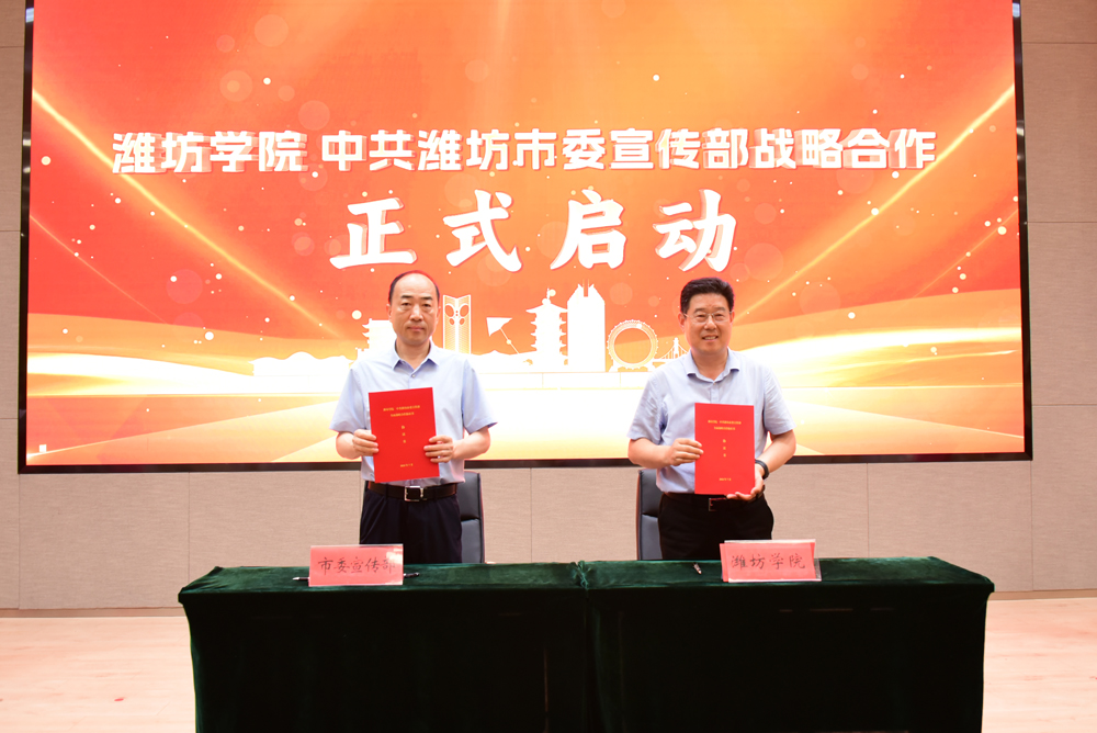 会上,张晓静作工作交流展示,孙磊和王守全分别代表潍坊市委宣传部、潍坊学院签订战略合作协议。