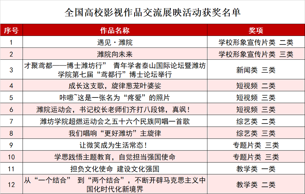 本网讯 7月6日,中国教育电视协会高校电视专业委员会2024年学术年会暨全国高校影视作品交流展映活动举行。潍坊学院共有12部视频作品获表彰,分别获得1项一类奖、4项二类奖、7项三类奖。