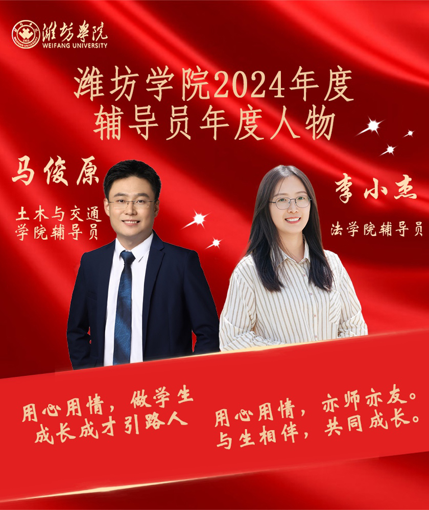 本网讯 近日,由学生工作处主办的潍坊学院2024年度“辅导员年度人物”评选活动落下帷幕,土木与交通学院辅导员马俊原,法学院辅导员李小杰荣获2024年度“潍坊学院辅导员年度人物”荣誉称号。