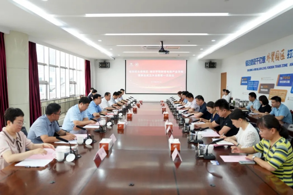本网讯 8月1日,潍坊学院跨境电商产业学院理事会成立大会暨第一次会议在潍坊综合保税区举行。学校副校长王成端,潍坊综合保税区党工委书记王龙堂、党群工作部部长沈吉宝,潍坊市产教融合研究院执行院长冯秀红、副院长王立浩,潍坊汇达供应链有限公司董事长韩庆伟、潍坊中科工业设计研究院有限公司总经理李洪涛出席活动。