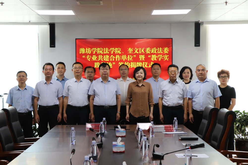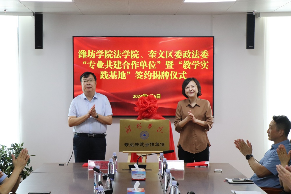 本网讯 为促进法学教育与司法实践深度融合,8月6日,学校与奎文区委政法委举行“专业共建合作单位”签约暨“教学实践基地”揭牌仪式。学校副校长王成端,奎文区委副书记陈珊珊,奎文区委常委、政法委书记范绍顺出席活动。