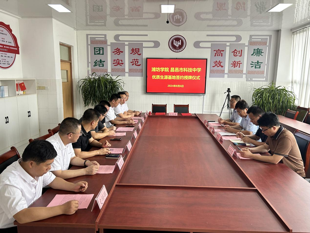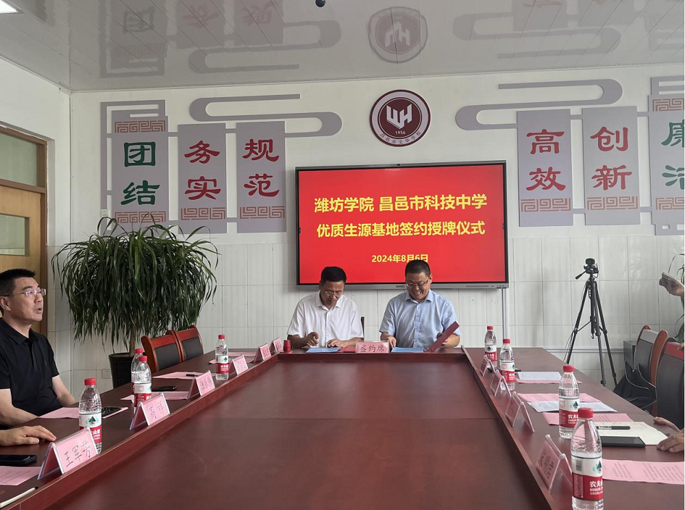 侯金奎介绍了学校的办学情况,授予昌邑市科技中学“潍坊学院优质生源基地”牌匾。台夕市与刘焕文签署优质生源基地协议。