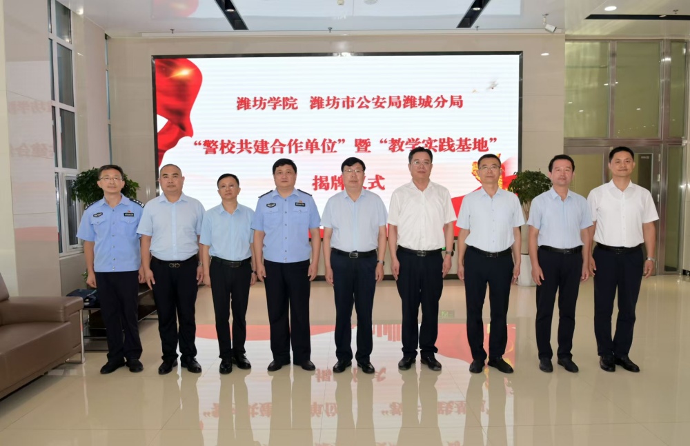 本网讯 近日,学校与潍坊市公安局潍城分局举行“专业共建合作单位”签约暨“教学实践基地”揭牌仪式。学校副校长王成端,潍城区委副书记、组织部部长李飞雨,潍城区副区长、公安分局党委书记、局长付向华出席活动。