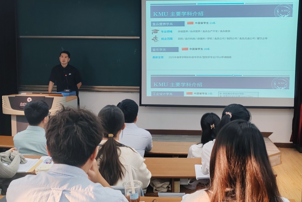 座谈会后,崔峰为韩国留学项目班全体学生进行韩国国民大学留学政策宣讲,详细解读了该校的专业设置、入学条件、奖学金政策等,就学生关心的问题给予现场解答。