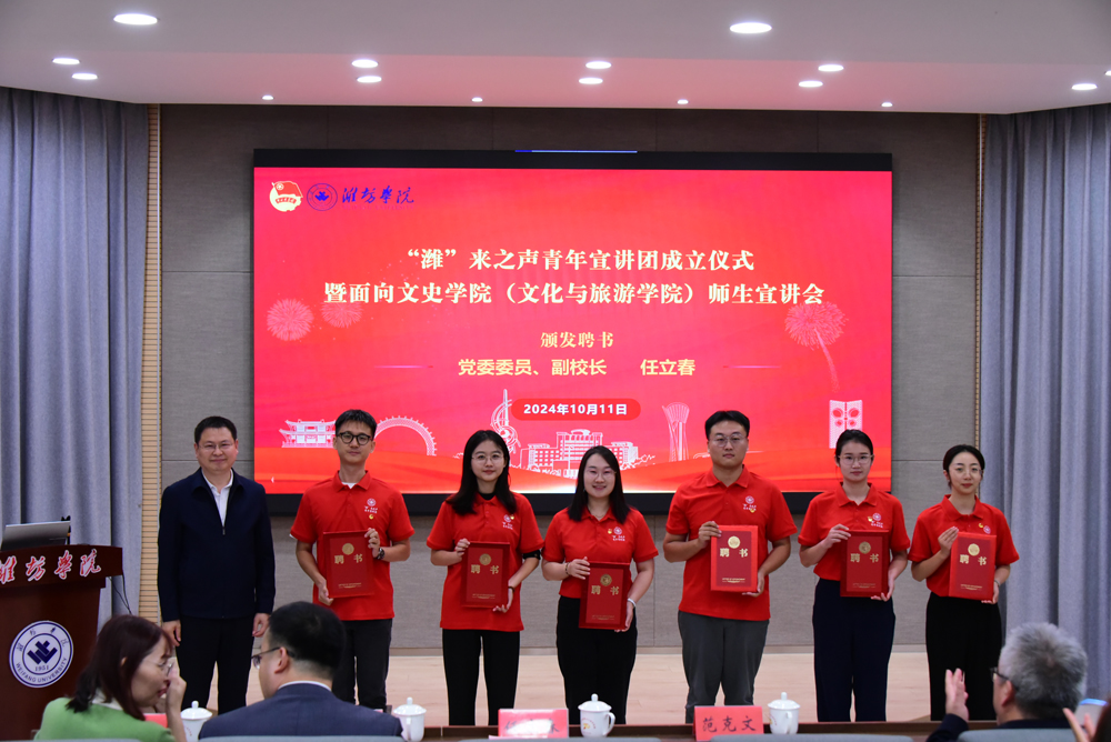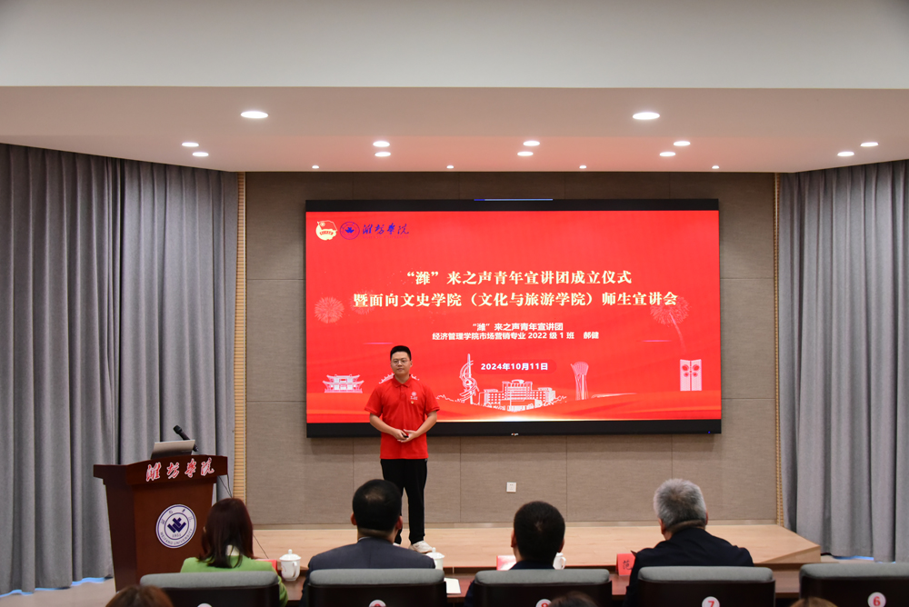 本网讯 为深入学习贯彻习近平新时代中国特色社会主义思想和党的二十届三中全会精神,以“青言青语”阐释解析马克思主义中国化最新成果,对青年学生进行理想信念教育,10月11日,学校团委在知新楼4210举办“潍”来之声青年宣讲团成立仪式暨面向文史学院(文化与旅游学院)师生宣讲会。学校党委委员、副校长任立春出席活动。