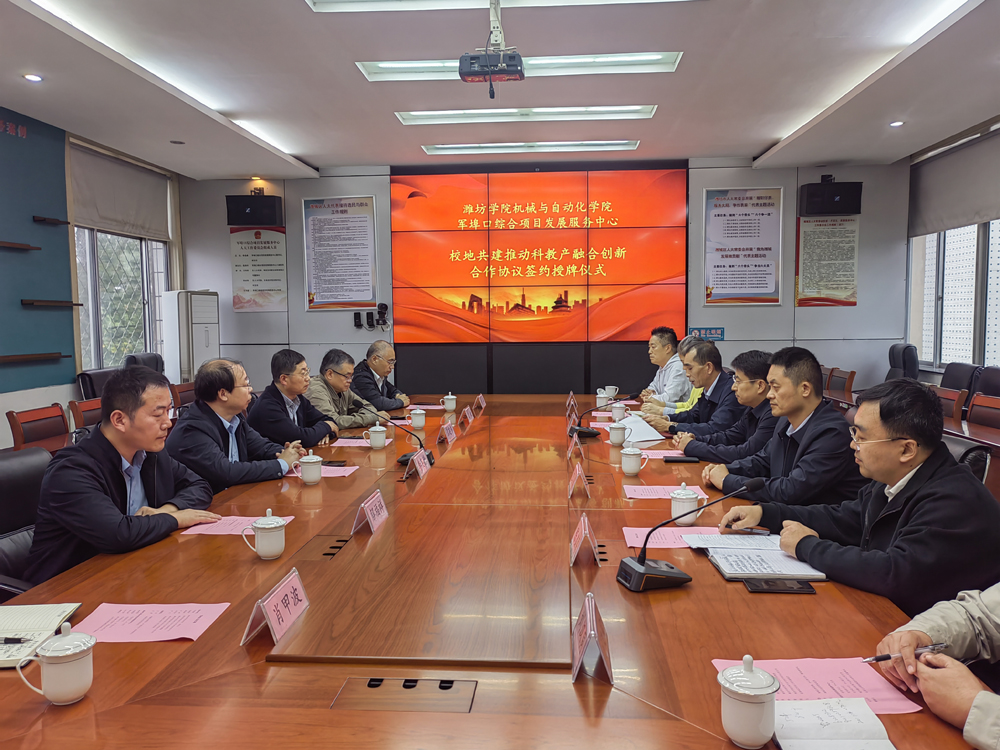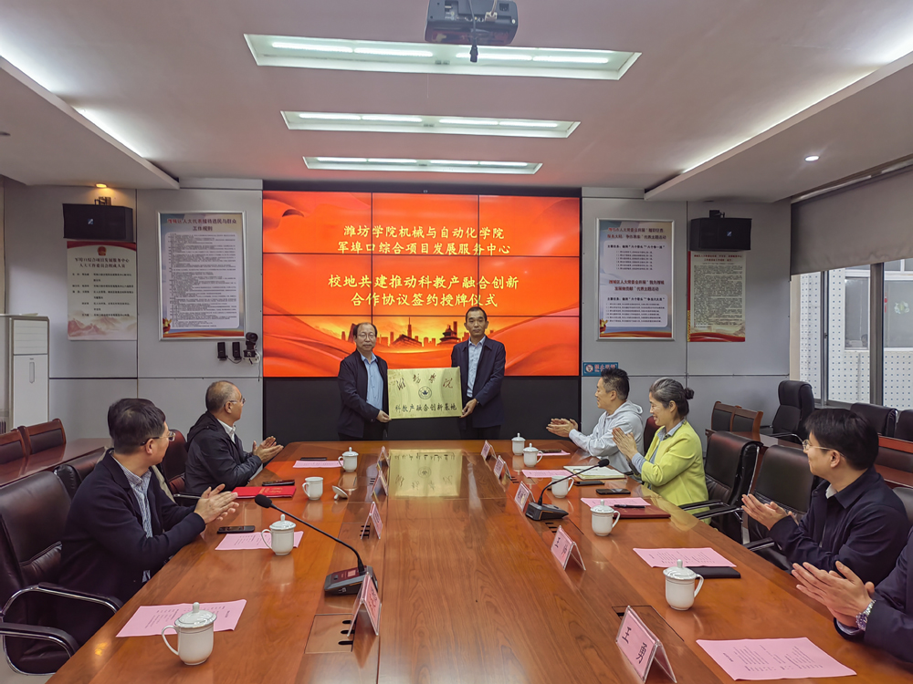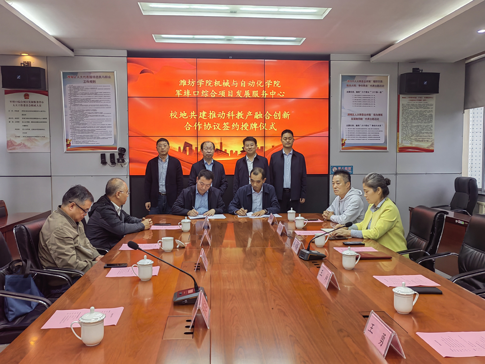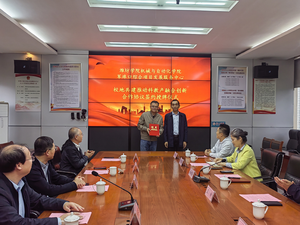 机械与自动化学院与军埠口综合项目发展服务中心,分别代表校地双方签署了科教产融合创新合作协议,李英德代表学校向军埠口综合项目发展服务中心,授予“潍坊学院科教产融合创新基地”牌匾。军埠口综合项目发展服务中心聘任机械与自动化学院宋健教授,为军埠口综合项目发展服务中心产业创新发展顾问并颁发了聘书。