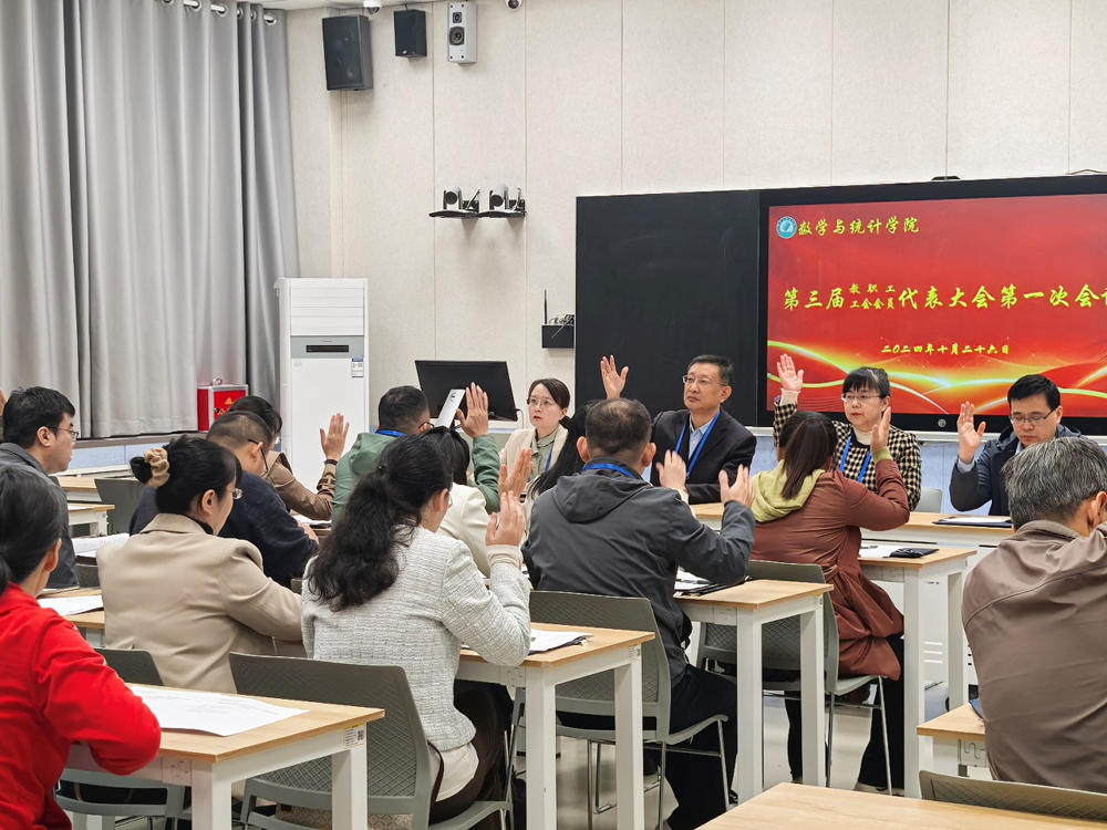 本网讯 10月26日,数学与统计学院召开第三届教职工代表大会第一次会议暨第三届工会会员代表大会第一次会议(以下简称学院“双代会”),听取审议并表决通过《学院工作报告》,审议并表决通过《数学与统计学院2024年奖励性绩效工资发放办法》,选举新一届工会委员会委员等。学校工会主席张华到会指导,该院郎益伟、李梅霞、车海涛等37名正式代表,籍法俊、蔡建生等4名列席代表参加会议。该院党委副书记杨颂主持会议。