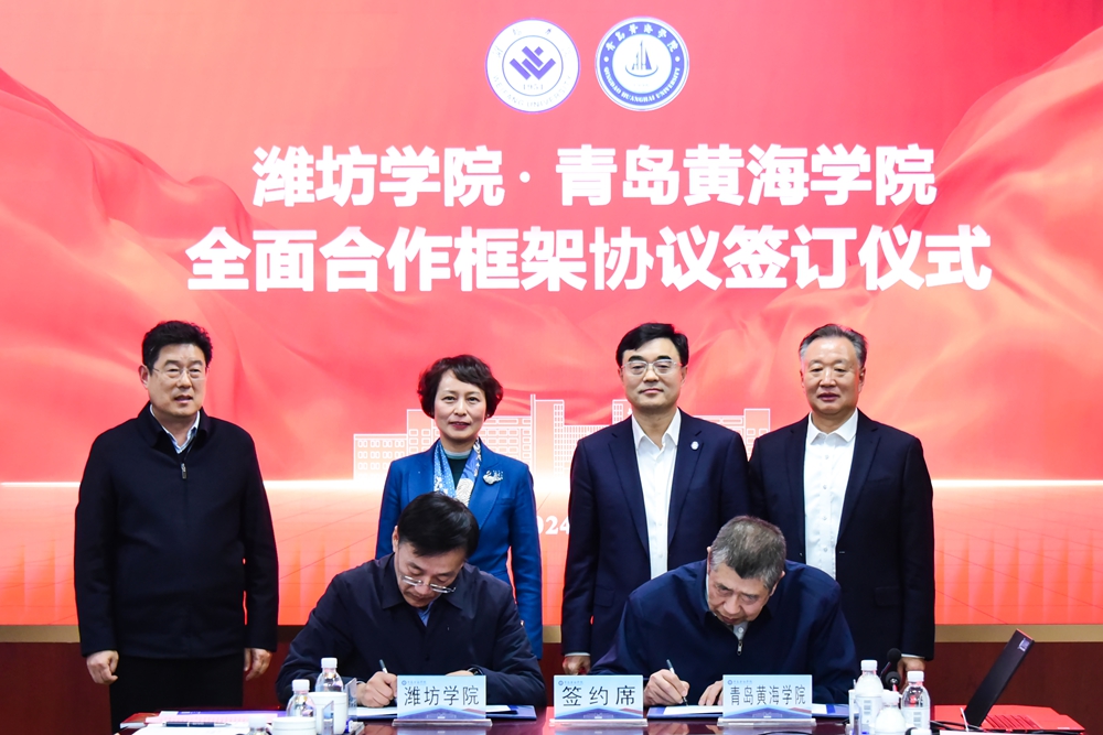 当天下午,学校与青岛黄海学院全面合作框架协议签约仪式举行。来逢波和李清山代表双方签署协议,两校对口部门进行了座谈交流。根据协议约定,两校将在党建工作、师资队伍建设、人才培养、学科专业、教学资源、科学研究、国际交流等方面深化合作交流,打造校际合作的典范和标杆。