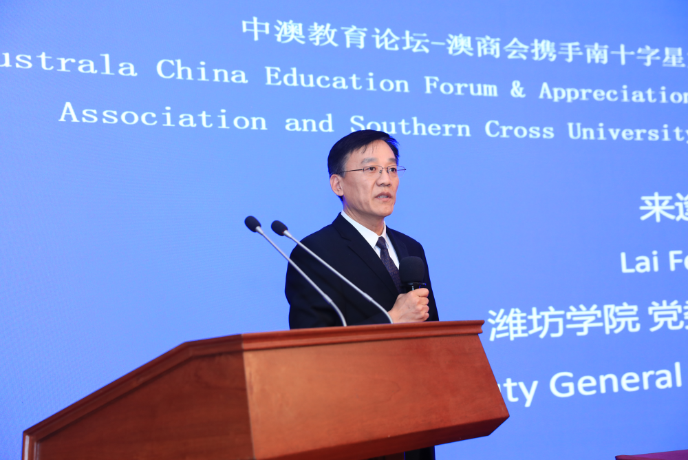 来逢波介绍了学校的发展脉络、办学特色、学科优势、人才科技以及近年来在国际教育交流合作方面的积极探索与实践成果。他表示,中澳教育交流合作意义深远,不仅有助于双方高校在学术研究、人才培养等方面相互借鉴与提升,更为两国师生提供广阔的国际视野和多元文化交流平台。潍坊学院一直致力于推动国际教育合作多元化,此次论坛为学校与澳大利亚高校进一步拓展合作领域、创新合作模式提供了宝贵机遇。